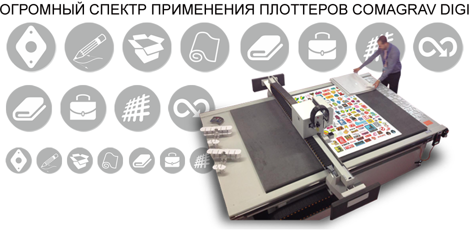 Пользователями планшетных плоттеров Comagrav DIGI является огромный спектр предприятий, в производственном процессе которых необходима сквозная резка листовых и рулонных материалов. Это электротехнические, упаковочные, автомобиле и авиастроительные, рекламнопроизводственные предприятия, также предприятия легкой промышленности, производители тентовых конструкций и изделий из композитных материалов, кожгалантерейные предприятия и др.